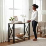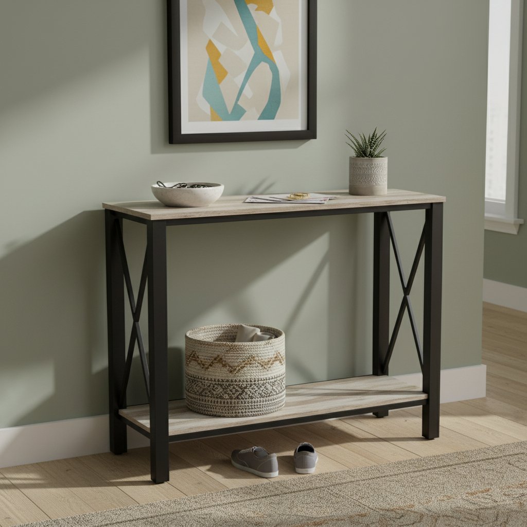 Elevate your home’s aesthetic with the Krelontix Modern Farmhouse Sofa Table. This elegantly designed console table combines rustic warmth with industrial-chic style, creating a functional and beautiful accent piece for your living room, entryway, or hallway. Its narrow profile makes it the perfect solution for adding surface space without sacrificing room.